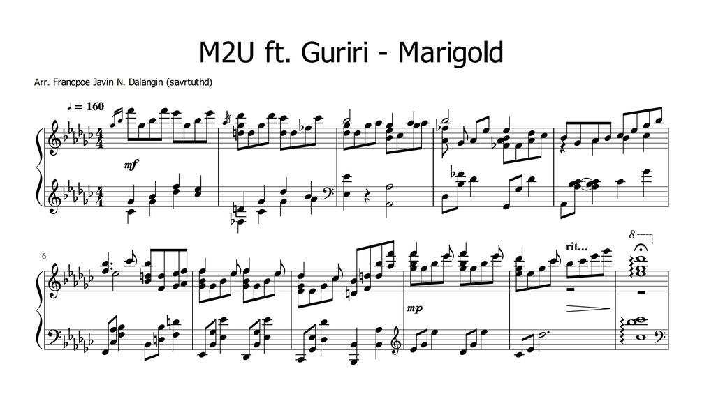 M2U ft. Guriri | Marigold | Piano Sheet music$5+$5+https://schema.org/InStockusdFrancpoe Javin Nachor Dalangin0 ratingsName a fair price:$I want this!Size150 KBLength4 pagesAdd to wishlist New wishlistCopy product URL